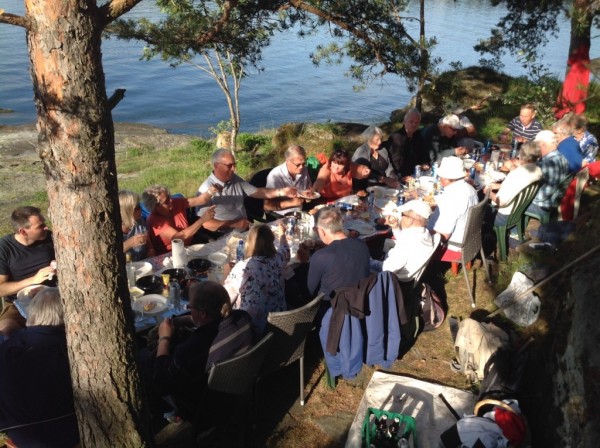24 som hadde en hyggelig kveld med reker og tilhørende drikke på hytta til