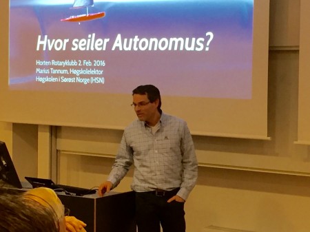 Rektor Petter Aasen var foredragsholder denne kvelden, og han berettet om situasjonen for høgskolen i dag og om mulighetene fremover. Med sine snart 10.000 studenter og ansatte, et hovedbøl i Horten og tre mer eller mindre autonome satelitter i Buskerud og sist men ikke minst et hardtslående Kunnskapsdepartement som motiverer/ truer/lokker/driver institusjonene for høyere utdanning fram mot større, mer spesialiserte og faglig sterkere enheter. Høgskolen går spennende tider i møte. Utviklingen vil virke direkte og tungt inn på Hortens-samfunnet. Et meget interessant foredrag.